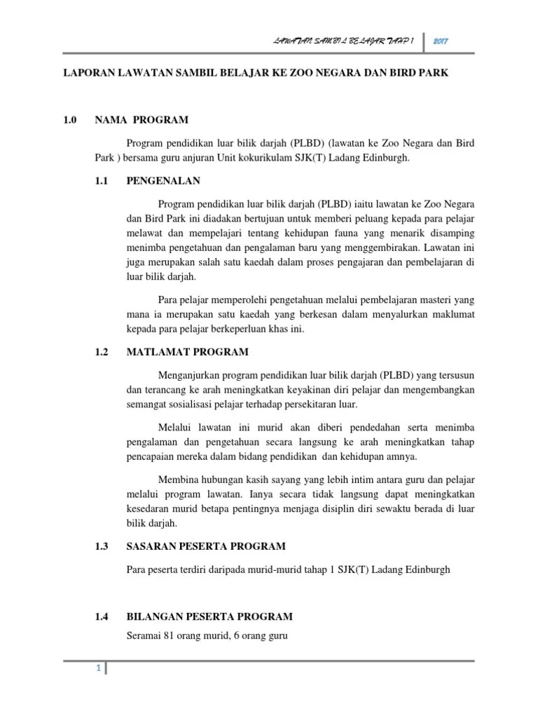 Contoh laporan impak lawatan sambil belajar (pendidikan khas). Lawatan sambil belajar ke zoo taiping (kpul4). Lawatan sambil belajar ke zoo negara, hulu kelang , selangor. Kami pun berehat sambil makan makanan di sebuah restoran. Untuk melahirkan generasi pengguna yang bijak, .